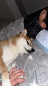 上がってくる柴犬です。(笑)なんなら長男をおしのけて布団で寝ています。